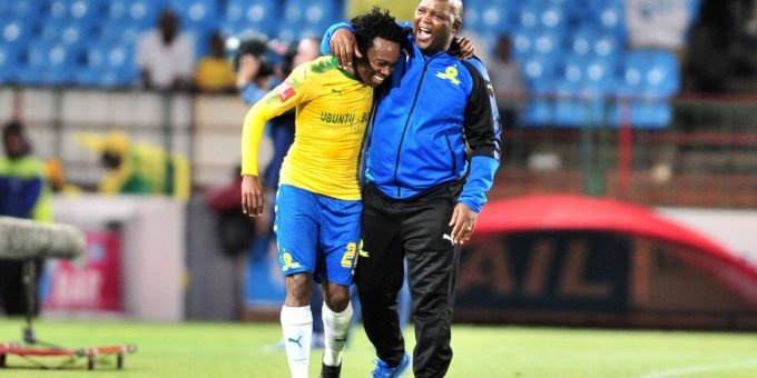 Themba zwane celebrates his goal with percy tau during the absa premiership match between mamelodi sundowns and bidvest wits.